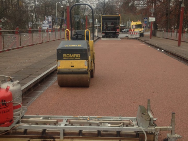 Nacharbeiten einer Arbeitsfuge in einer roten Gussasphaltfläche auf der Tiergartenbrücke in München.